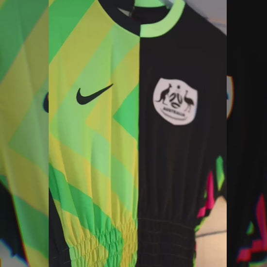 Our talented team of makers has transformed the iconic National Team kit with intricate lacing, shirring and spliced construction details for a unique look. Proudly wear it for Australia, and style it for the stands.